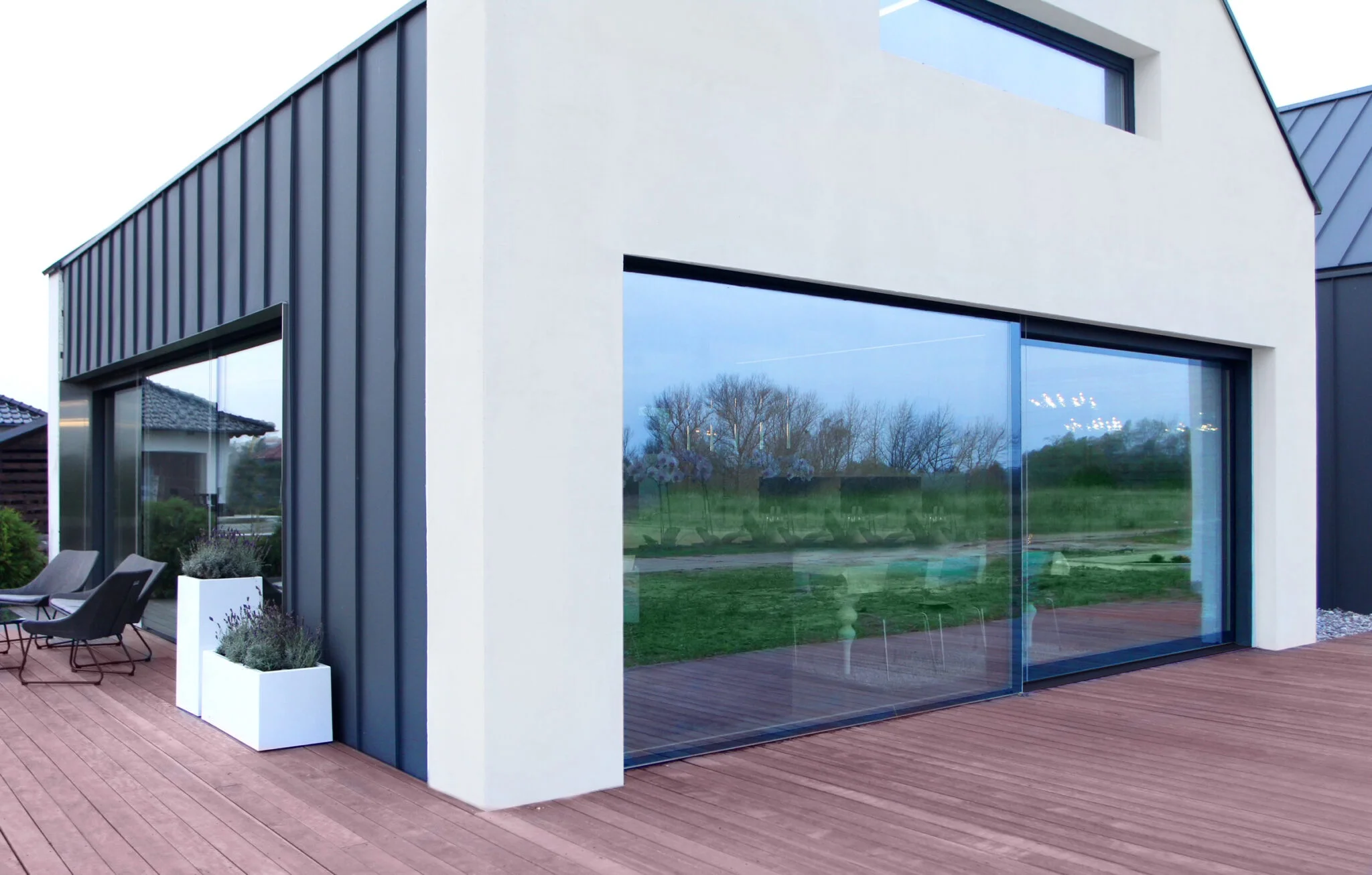 Fenstersysteme Aluron AS75 in der Glas Line-Version ermöglichen die Gestaltung einer visuell einheitlichen Architektur: von Fenstern über Eingangstüren bis hin zu Schiebekonstruktionen – im gesamten Gebäude, ob Haus oder Residenz. Gemeinsamer Nenner aller Lösungen sind klare Linien, moderne Eleganz und die Reduktion sichtbarer Konstruktionselemente. Die vollständige Abdeckung der Flügel mit emailliertem Glas verleiht ihnen ein einheitliches, exklusives Erscheinungsbild. Das Glas kann spiegelnd ausgeführt oder in jeder Farbe der RAL-Palette gestaltet werden, während die minimale, 3 mm breite Silikonfuge zusätzlich die Präzision und hohe Verarbeitungsqualität unterstreicht.
