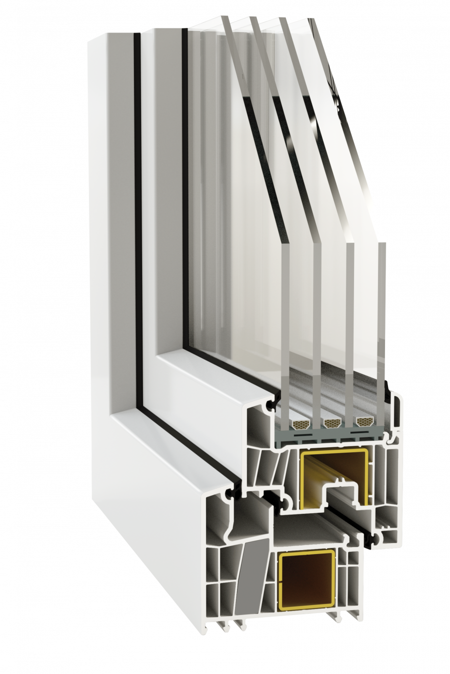 Einer der größten Vorteile des DECCO 83-Systems ist seine herausragende Wärmedämmung. Dank der fortschrittlichen 7-Kammer-Technologie und der zusätzlichen dritten Dichtung erreicht das Profil einen beeindruckenden Wärmedurchgangskoeffizienten Uw von 0,59 W/m²K (bei einem Referenzfenster mit einer 4/12/4/12/4/12/4 Verglasung).