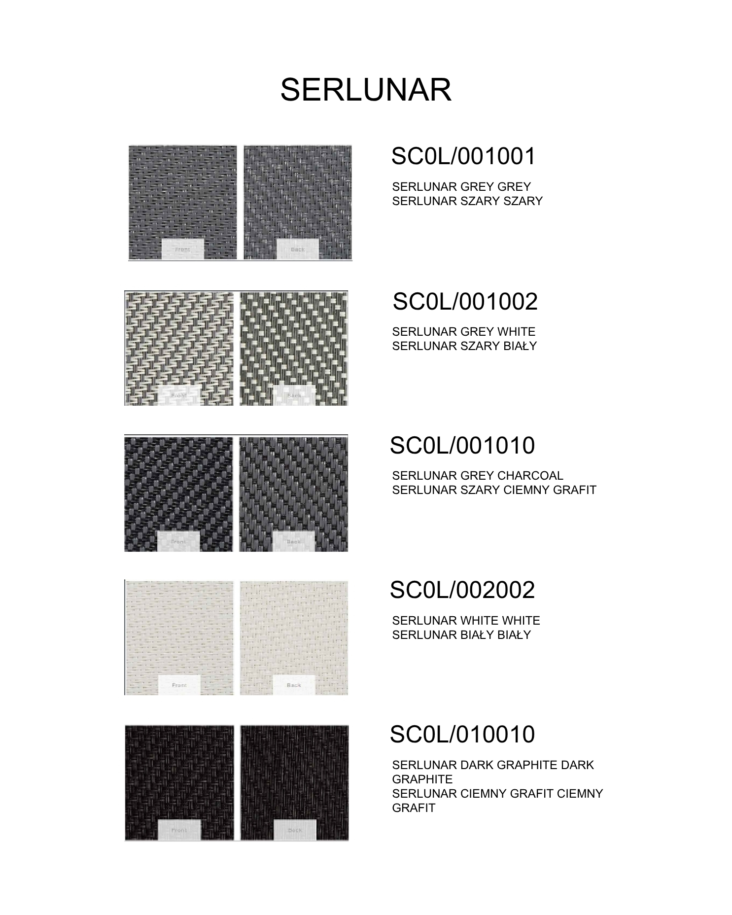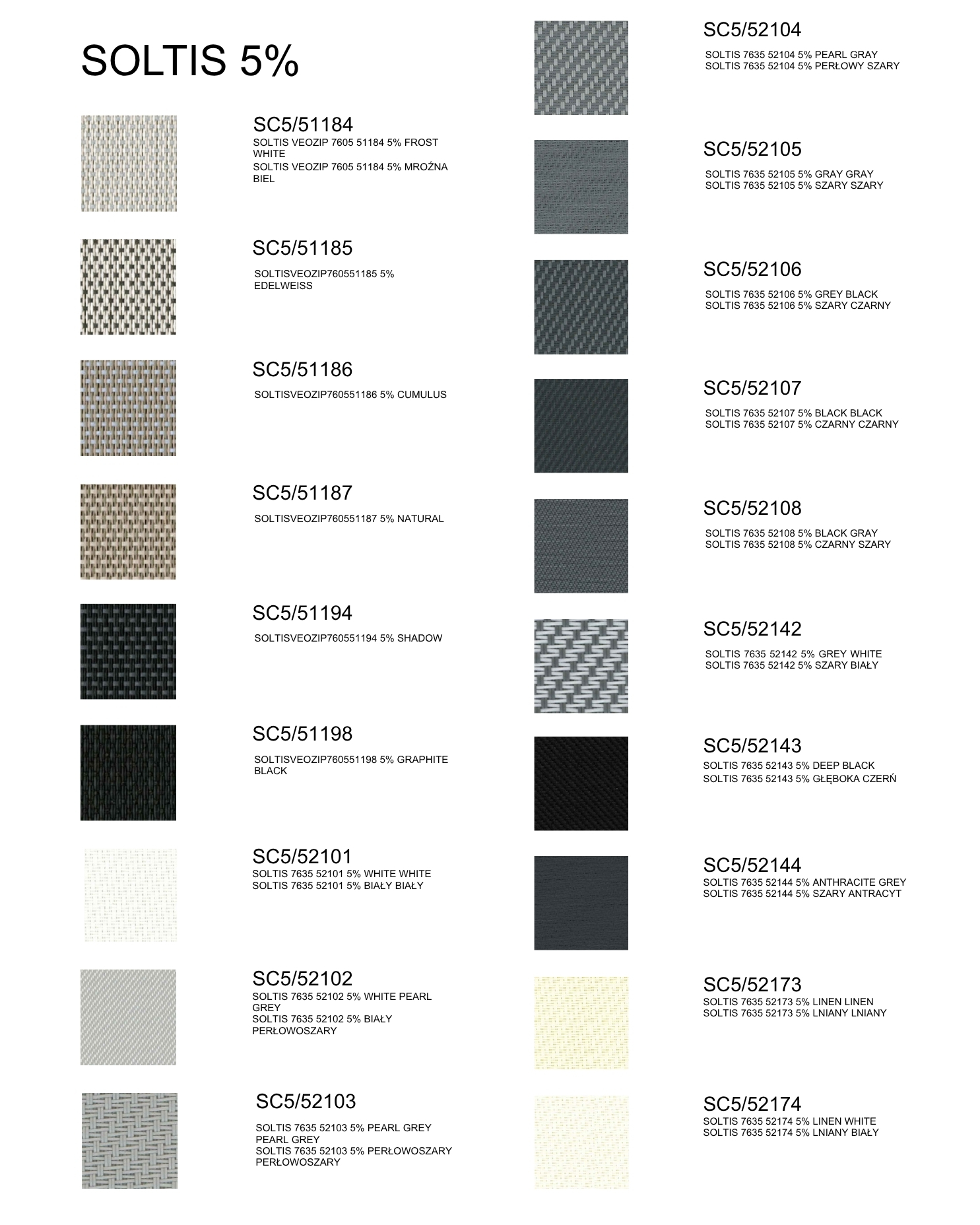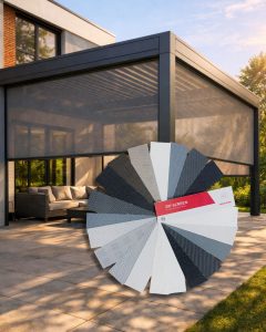 Gewebe – Funktionalität und Design. Das System bietet eine breite Auswahl an Screen-Geweben. Öffnungsfaktor: 0 %, 1 %, 4 %, 5 %. Die Gewebe ermöglichen die Kontrolle des Lichteinfalls, sorgen für Privatsphäre und schützen vor Überhitzung der Innenräume. Große Farbauswahl: Weißtöne, Grautöne, Anthrazit, Beige und Naturfarben sowie tiefes Schwarz.