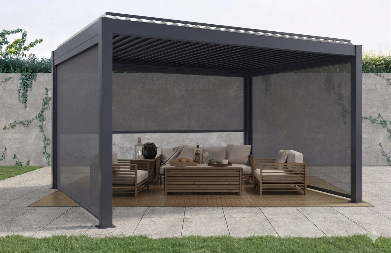 ZIP-Screen ECO ist optimal kompatibel mit Aluminiumpergolen, Terrassenüberdachungen, Wintergärten sowie großen Schiebesystemen. Montagemöglichkeiten: zwischen den Konstruktionspfosten, außerhalb der Konstruktion, in Kombination mit Slide-Glass-Systemen.
