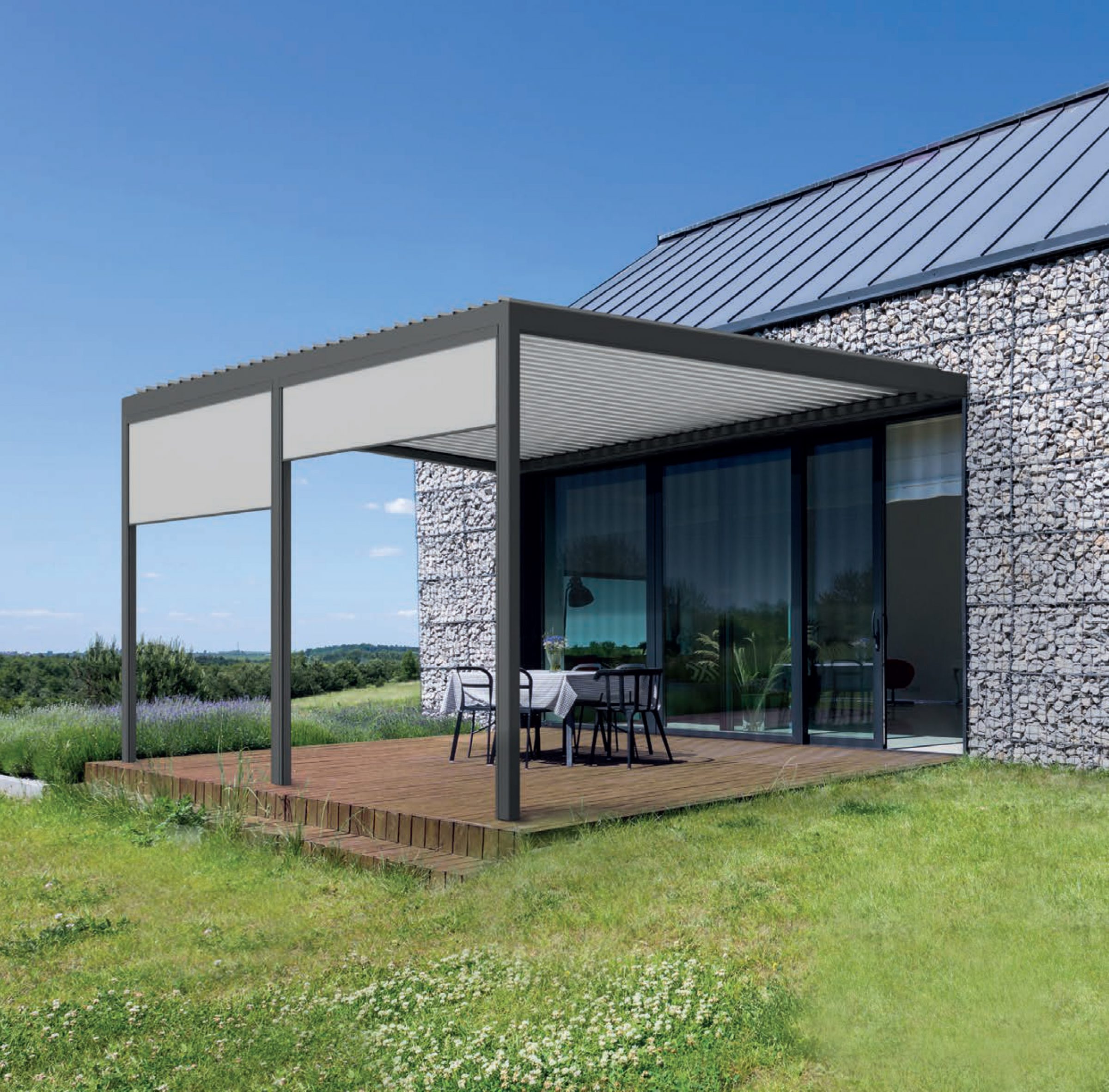Die PROLUXA Pergola bietet umfassenden Schutz vor Sonne, Regen und Wind. Im Falle des Daches wird dies durch Aluminiumlatten gewährleistet, die im Gegensatz zu Stoff luftdicht sind und kein Wasser durchlassen. Der Winkel der Lamellen kann frei von 0 bis 110 Grad eingestellt werden, je nach Sonneneinstrahlung und persönlicher Vorliebe.Seitlichen Schutz vor Regen, Wind oder Sonne bieten Ganzglas-Schiebeverglasungen oder ZIP-Abdeckungen. Sie bieten auch Schutz vor Insekten, was im Sommer besonders wichtig ist. Sowohl das Slide-Glass-System als auch die ZIP-Abdeckung können in der gleichen Farbe wie die PROLUXA-Pergola ausgeführt werden.