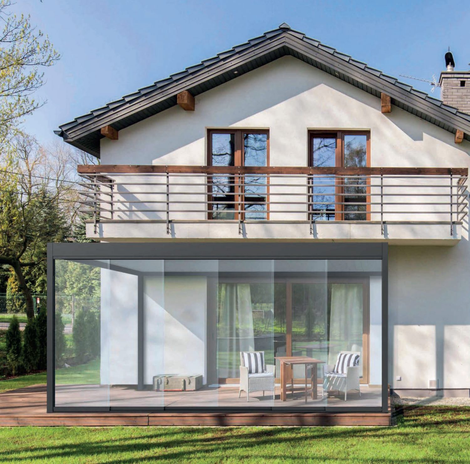 Wenn Sie möchten, dass die Seiten der Pergola von einer vertikalen Glaswand umschlossen werden, dann ist das rahmenlose Ganzglas-Schiebesystem Slide Glass die ideale Lösung. Das System besteht aus 3, 4 oder 5 Ganzglasflügeln, die sich gegenseitig auf unabhängigen Schienen verschieben. Der Rahmen ist sehr niedrig und in der Farbe der Pergola ausgeführt. Die Flügel können von innen verriegelt werden und bieten so ein höheres Maß an Sicherheit. Standardmäßig wird gehärtetes 10-mm-Glas eingesetzt, das die Sicherheit der Benutzer gewährleistet und gleichzeitig einen wirksamen Schutz gegen Wind bietet. Die Konstruktion ist optisch sehr leicht, was sie zu einer perfekten Ergänzung der PROLUXA-Pergola macht.3